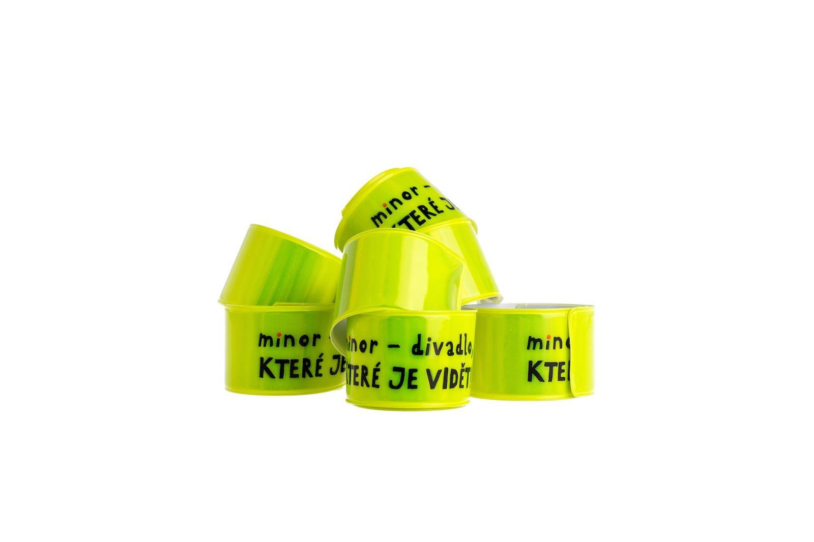 Samonavíjecí signální odrazová páska do šera a tmy na ruku, nohu, tašku atd. Zelenožlutá. S nápisem Minor - divadlo, které je vidět! Rozměr 30x3 cm.