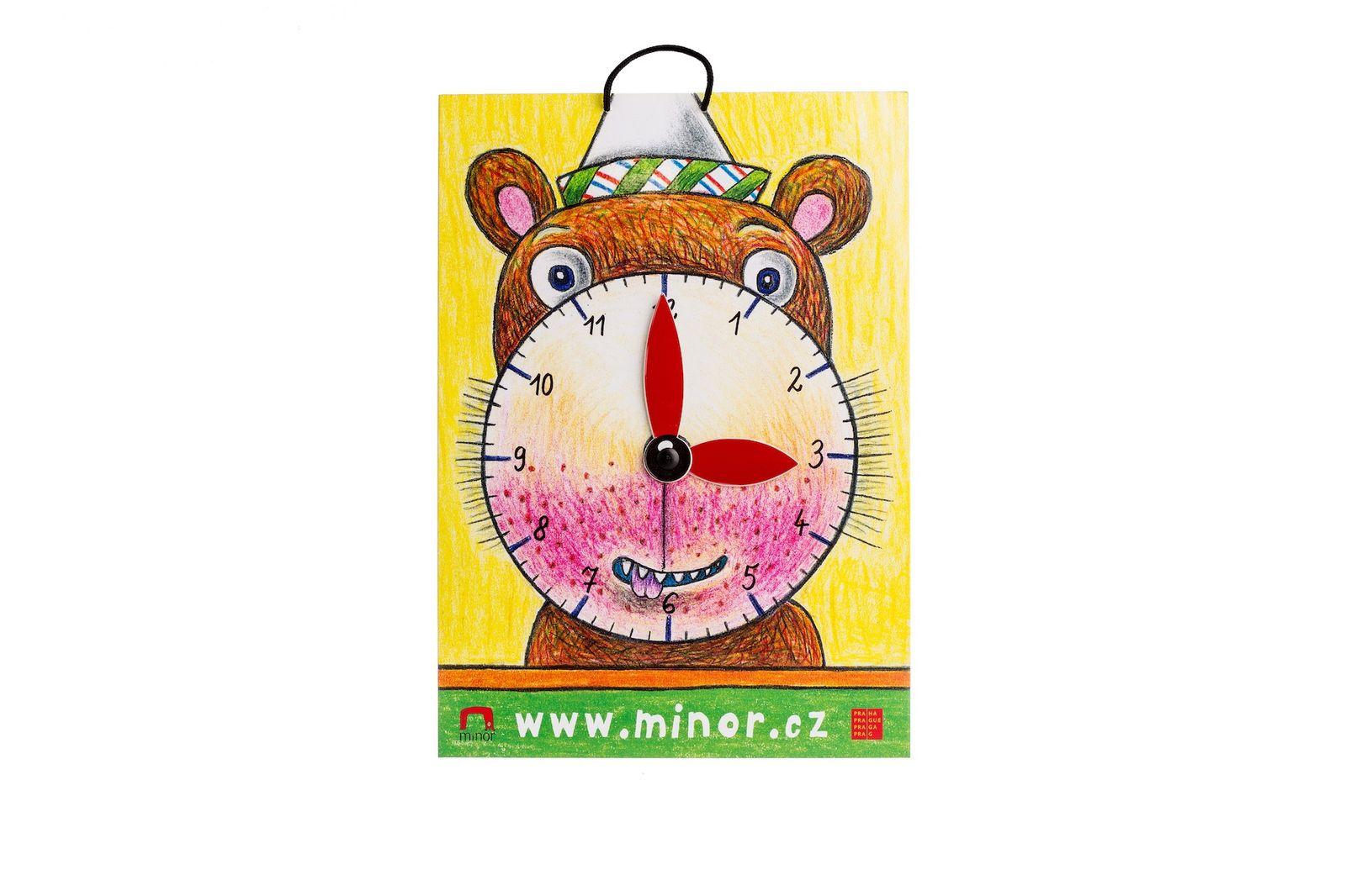 Tvrdý karton A4 s motivem a posuvnými ručičkami k výuce času. Možnost zavěšení.