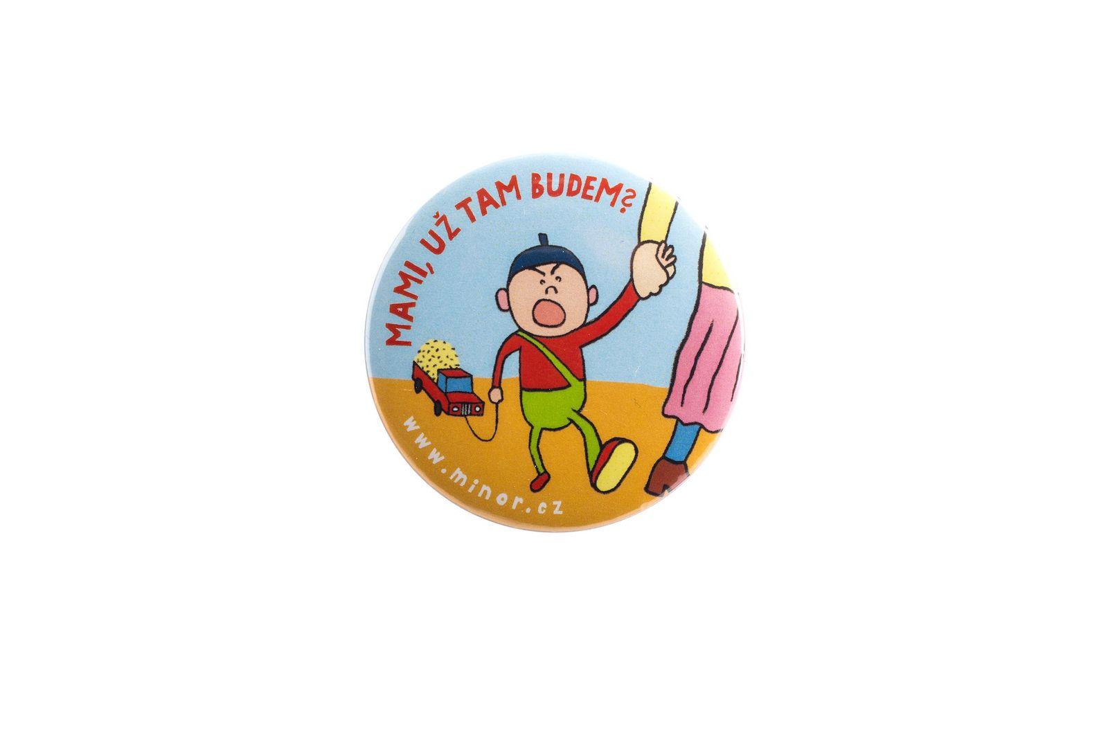 3.) obdélník 6 x 4 cm, možnosti: špendlík / magnet motiv položen na výšku (Záhada hlavolamu, Zátopek, Sněhová královna, Divadlo) na šířku (Demokracie, Nanuk, Pinokio, O veliké řepě, Robin Hood, Game, Koukej svět, Mami už tam budem?)