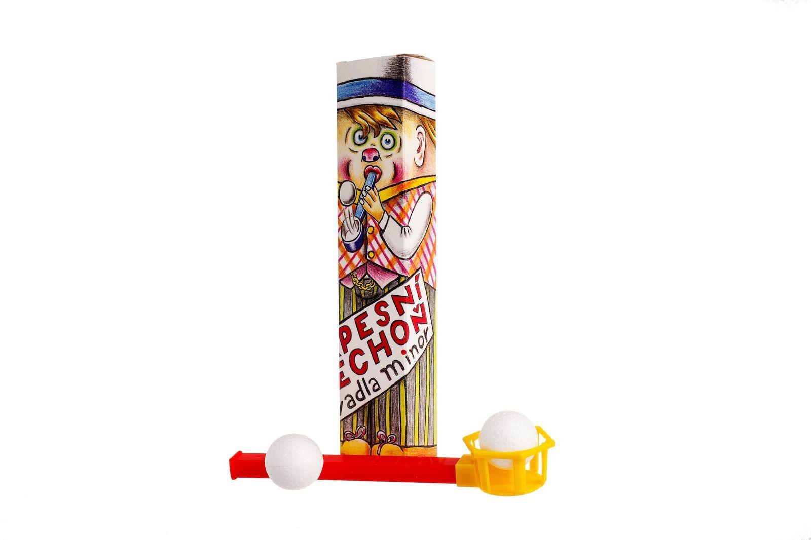 Červená či modrá 16 cm umělohmotná foukačka se žlutým košíčkem, nadnášející polystyrenový míček pomocí vašeho dechu. Foukačka, 2x míček, a to celé ve stylové papírové krabičce.