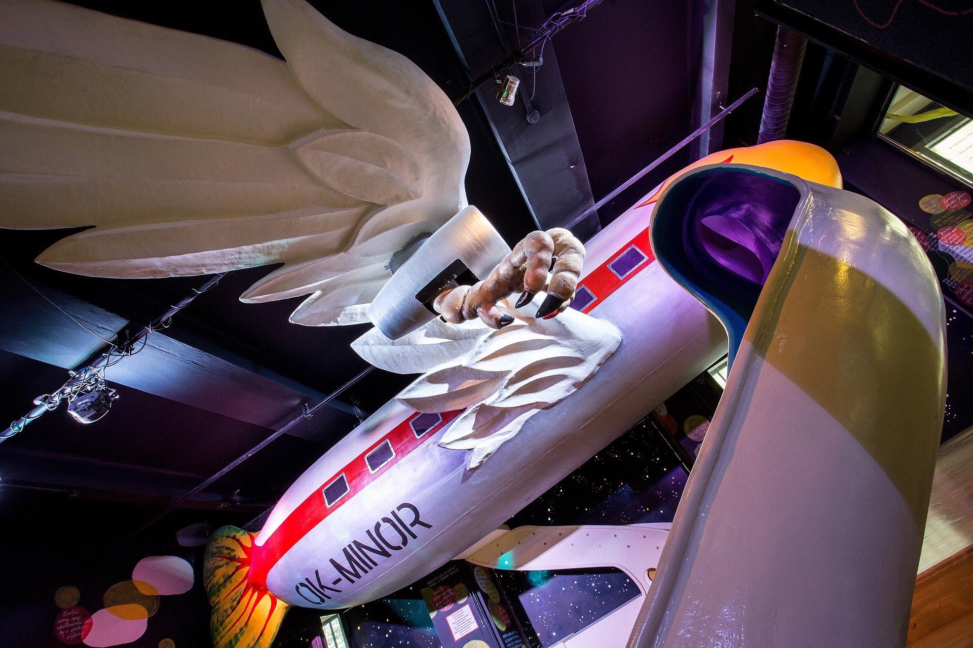 Last year’s installation in our relaxing Minor gallery has been elegantly recycled and it has partially covered itself in forest wood. Our explorer and adventurer Josef Minor Ph.D. has tumbled here with his scientific aircraft.